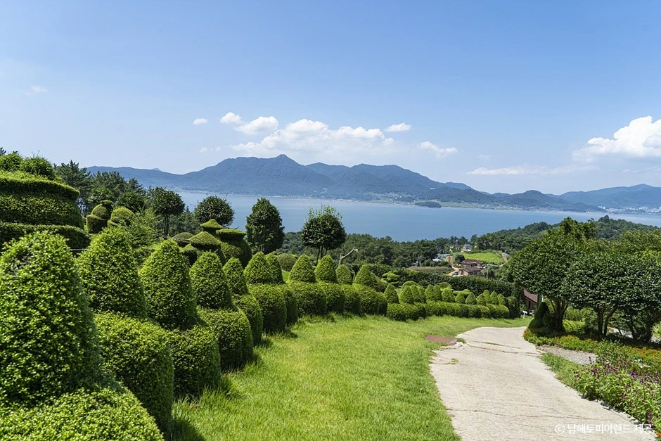 남해토피아랜드''토피어리''는 식물을 다듬어 여러가지 보기 좋은 모양으로 만들어놓은 작품을 의미한다. 남해 토피아랜드는 꽝꽝나무와 주목나무를 이상한 나라 엘리스처럼 다양한 조각상을 만들어 놓은 동화 같은 공원이다. 울창한 편백나무숲에서 피톤치드를 만끽하면서 편안하게 쉴 수 있는 공간이며 푸른 남해 앞바다를 시원하게 조망할 수 있는 곳에 위치해 그야말로 오션뷰 파크라고 할 수 있다. 또한, 야생화와 상록수가 많아 4계절 내내 푸른 공원이며 사진 찍기 좋은 조형물들도 많아 가족, 연인, 웨딩 또는 스냅 촬영 장소로도 더할 나위 없다. 취사는 불가능하나 도시락을 준비해서 편백나무숲 평상에서 즐길 수 있도록 배려한다. 재미있게 잘 다듬어진 토피어리 공원에서 낭만적인 피크닉을 즐겨보자.
